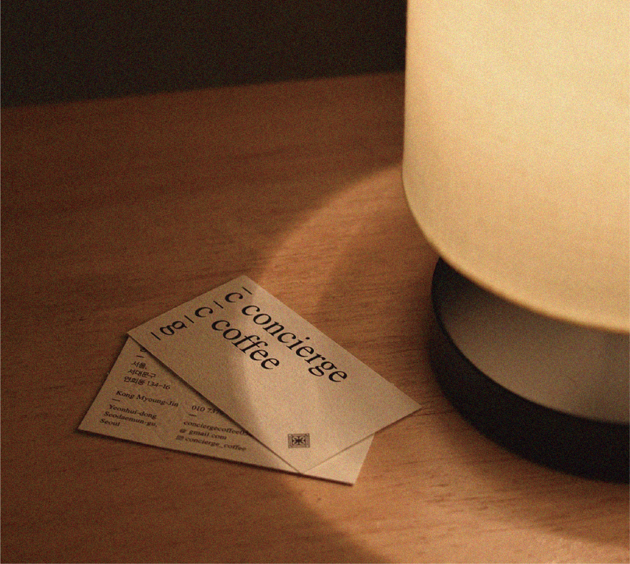 연희동에 위치한 부티크 호텔 컨셉의 컨시어지 커피는 클라이언트가 컨시어지와 로비보이에서 영감을 받아 상호를 정하였고, 컨시어지가 고객을 대하는 애티투드로 커피와 손님을 대하는 카페입니다. 컨시어지 정신에서 영감을 받아 ‘한 명의 고객을 위한 커피’라는 슬로건을 만들어 브랜드의 접객태도를 강조하였고 이를 바탕으로 ‘c/c/g’라는 상호와 심볼을 제작하였습니다. 프로젝트 당시 완공을 앞 둔 부티크 호텔 컨셉의 인테리어에 맞추어 그래픽과 패턴을 개발하고 타임즈 서체를 중심으로 미니멀한 무드의 BI를 공간 곳곳에 적용시켰습니다.